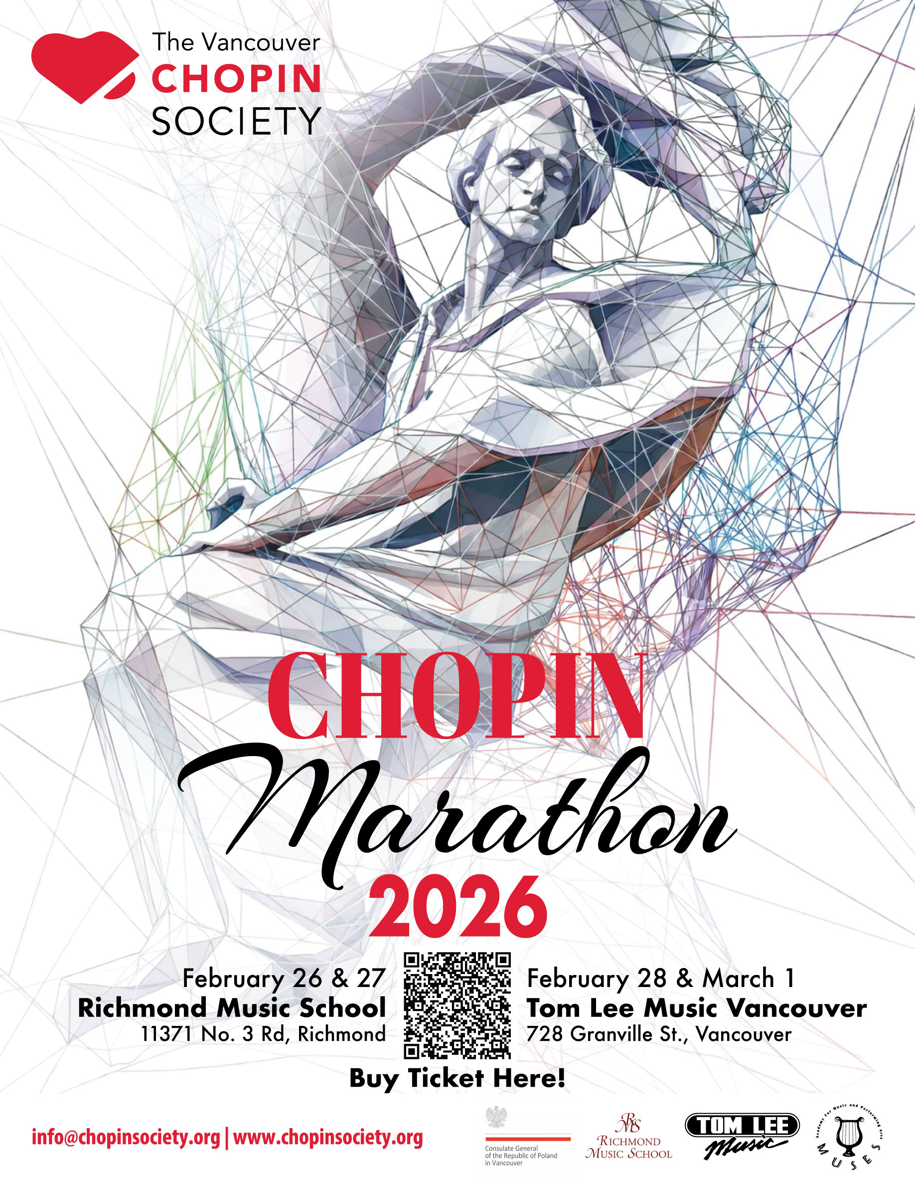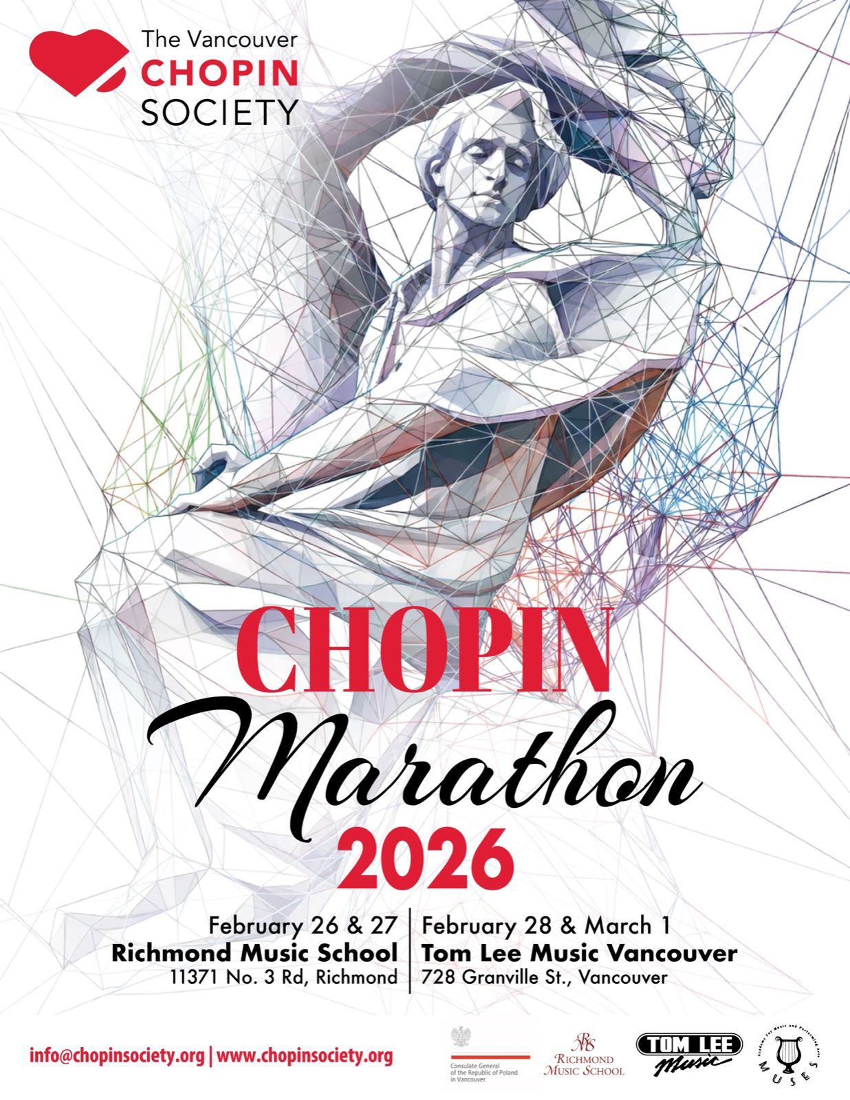 In order to celebrate the birthday of Chopin on March 1st, The Vancouver Chopin Society is once again hosting our annual Chopin Marathon, in collaboration with the Consulate General of the Republic of Poland in Vancouver, Tom Lee Music and Richmond Music School.